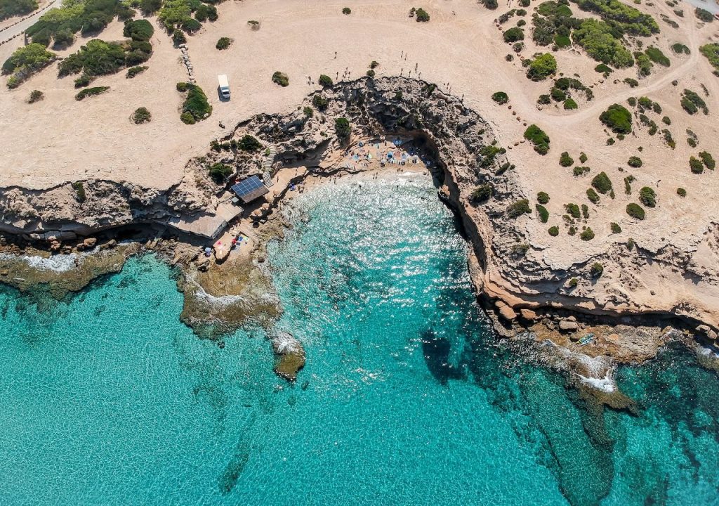 A 5 minutos en coche desde el pueblo de San Juan y apenas unos minutos desde la cueva, esta playa de Ibiza es una de las favoritas de los turistas y locales. Es una pequeña bahía apartada y presume de unas vistas impresionantes.